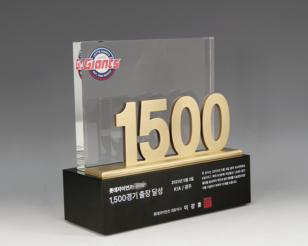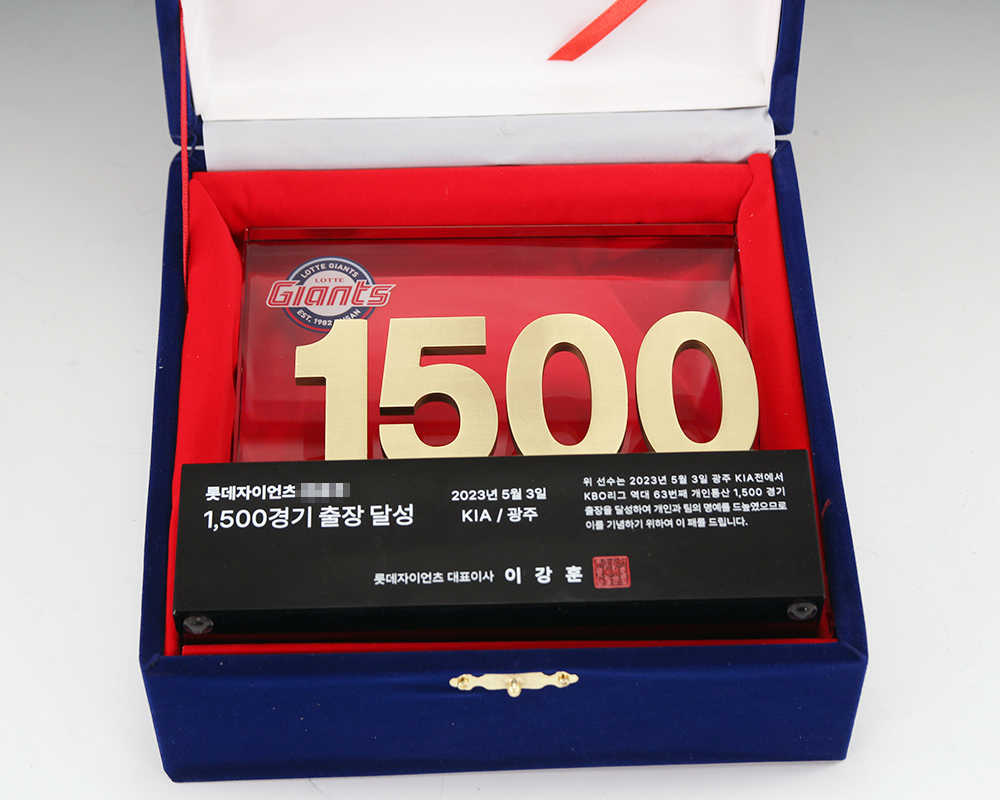 전준우 1500경기 출장 트로피 주문 제작 제품입니다.